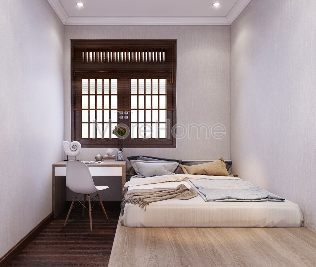 Phòng ngủ nhỏ nhưng vẫn được chú ý thiết kế đến từng chi tiết. Sự kết hợp giữa các chất liệu như gỗ, nỉ, giấy dán tường rất khéo léo tạo nên điểm nhấn cho không gian. Phào gỗ chạy xuyên suốt tất cả các phòng.