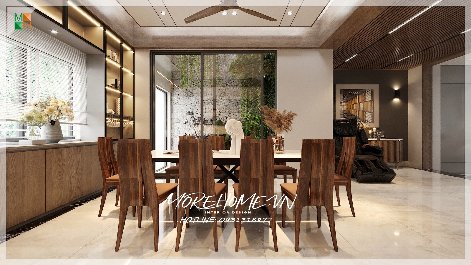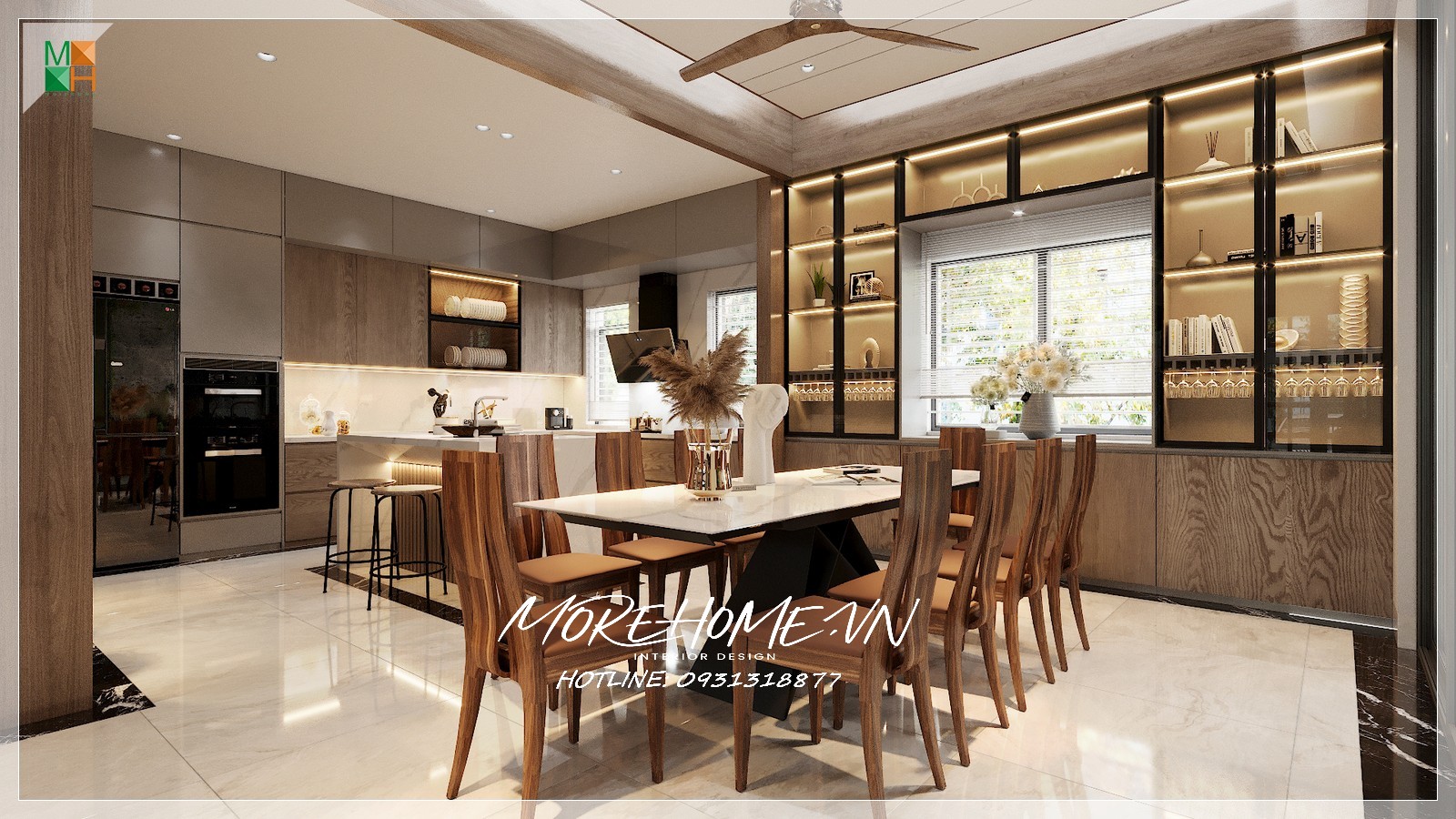 Được đặt 1 bộ bàn ghế nhìn khá đơn giản nhưng phù hợp với diện tích căn bếp gia chủ có, bộ ghế tối màu nhưng không hề mất đi sức hút, kết hợp với chiếc bàn mặt kính trong suốt 2 điều đó kết hợp lại tạo ra 1 tổng thể cân đối cho nhau.