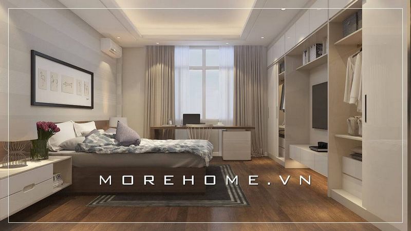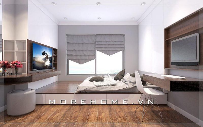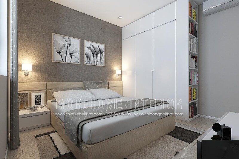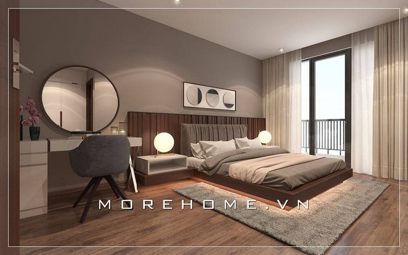 Giường ngủ chung cư gỗ công nghiệp nhẹ nhàng, tone màu sáng chủ đạo, phần cửa hướng ra ban công được thiết kế với diện tích lớn...tất cả được kết hợp một cách hài hòa tạo nên không gian phòng ngủ sang trọng và năng động