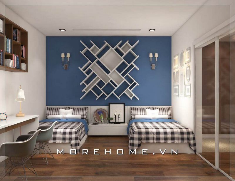 Lựa chọn kiểu giường hiện đại gỗ công nghiệp cho 2 bé trai giúp không gian phòng ngủ ấm áp, thân thiện, tạo cảm giác dễ chịu