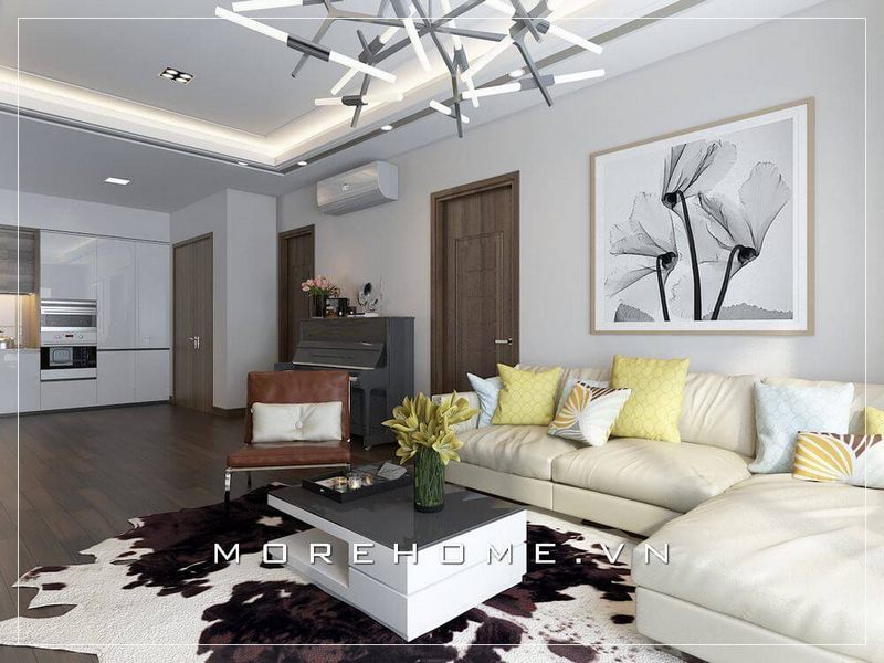 Sắc trắng đầy ấn tượng của bộ sofa da cao cấp thiết kế theo phong cách hiện đại dáng văng gọn gàng nổi bật giữa phòng khách căn hộ chung cư.
