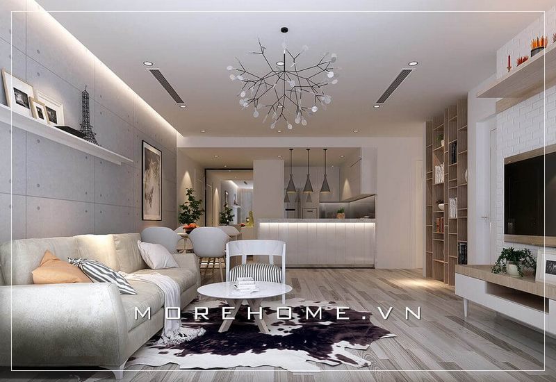 Mẫu sofa bọc vải màu trắng đơn giản cho không gian phòng khách hiện đại tạo nên không gian nhẹ nhàng, ấm cúng và tươi mới cho căn hộ chung cư
