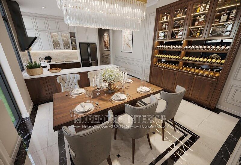 Bố trí nội thất phòng ăn hiện đại nhưng đẹp thông thoáng bởi ý tưởng tạo nên không gian mở từ hệ cửa kính rộng, lớn.