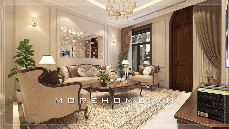 Vẻ đẹp mềm mại uyển chuyển trong lối thiết kế tân cổ điển từ bộ bàn ghế sofa cùng điểm nhấn trang trí trên tường phào chỉ lựa chọn ấn tượng cho không gian phòng khách biệt thự, nhà phố.