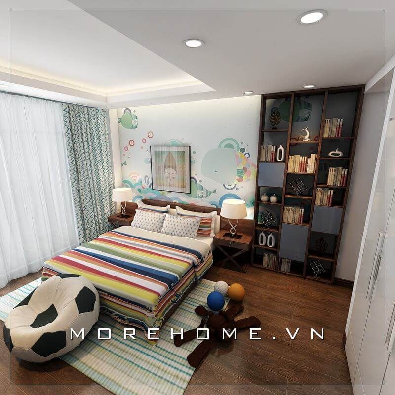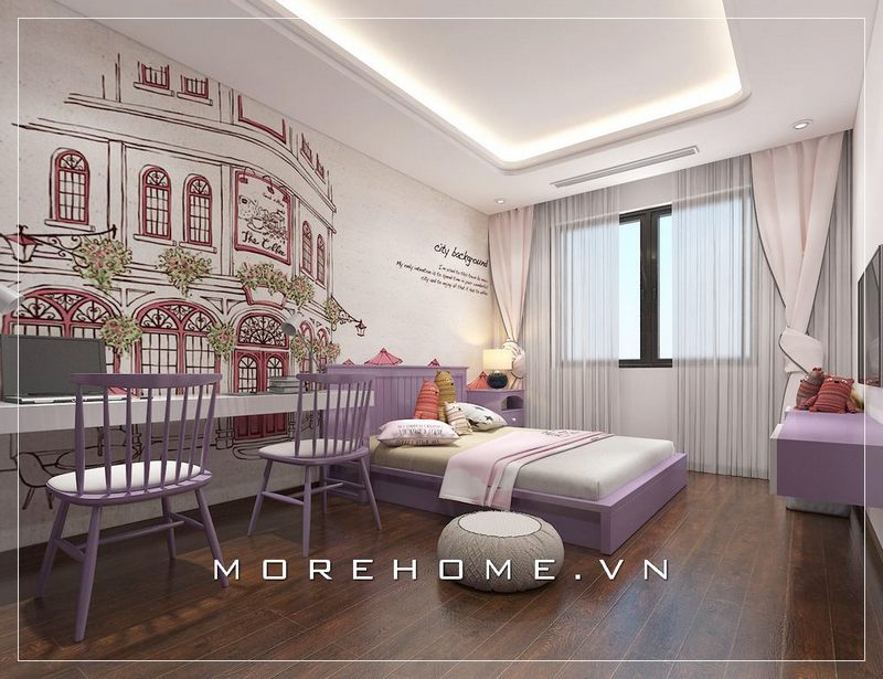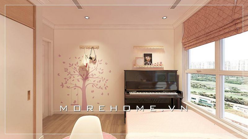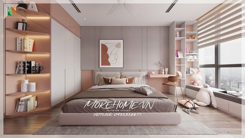 Nội thất phòng ngủ bé gái chung cư hiện đại được sắp xếp đầy khoa học, cửa sổ được thiết kế kích thước lớn đảm bảo căn phòng luôn thông thoáng, sinh động hơn