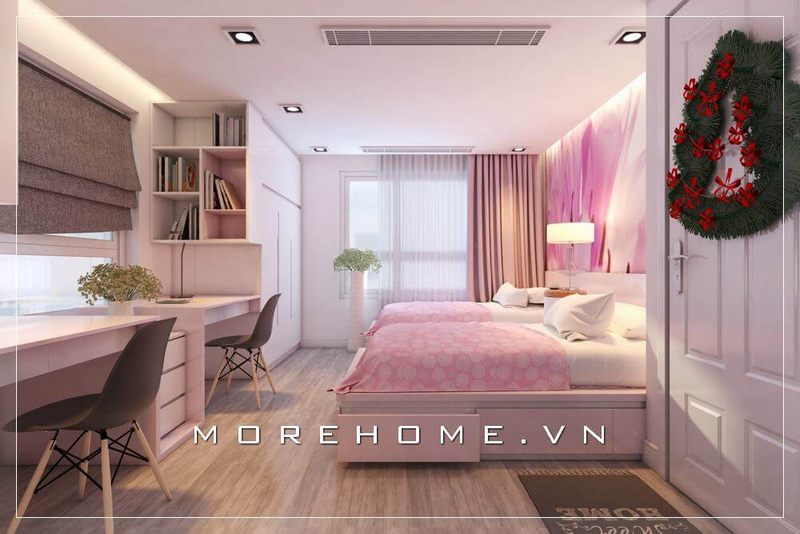 ý tưởng trang trí nội thất hiện đại cho phòng ngủ bé gái xinh xắn, đáng yêu với tone màu hồng và họa tiết hình cây lá dễ thương giúp con có một không gian nghỉ ngơi và học tập thoải mái nhất