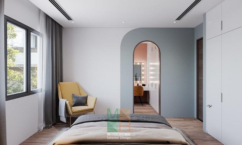 Phòng ngủ với thiết kế phong cách hiện đại được sắp xếp nội thất hợp lí phù hợp với không gian diện tích phòng