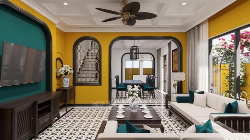Sử dụng hài hòa màu nâu gỗ - xanh chàm trong không gian nội thất phòng khách biệt thự