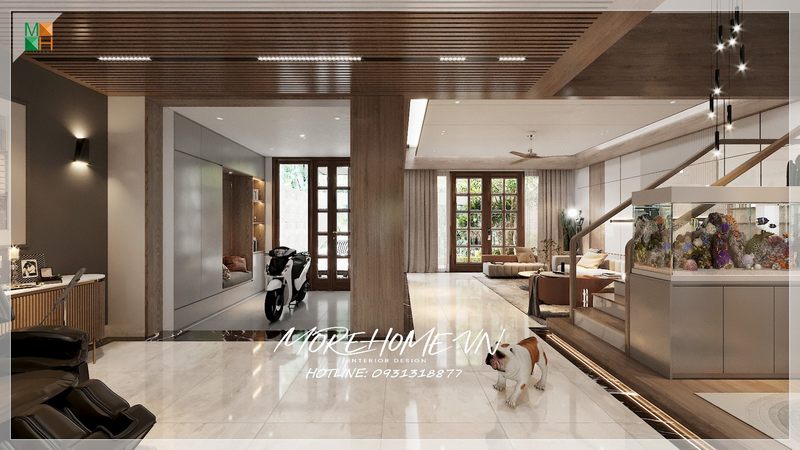 Thiết kế nội thất phòng khách ấn tượng với phong cách hiện đại sang trọng cùng sắc trầm chủ đạo.