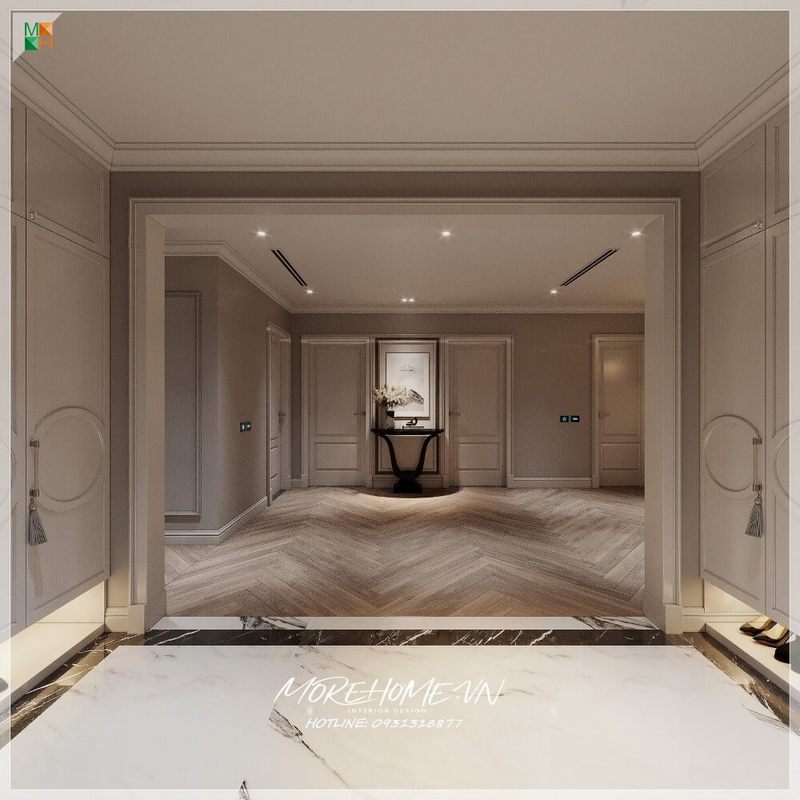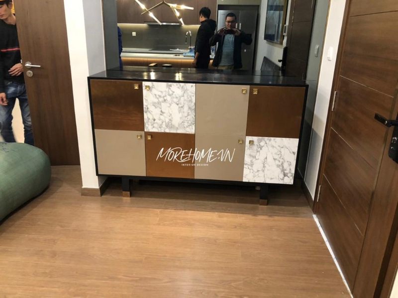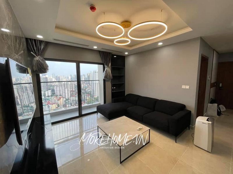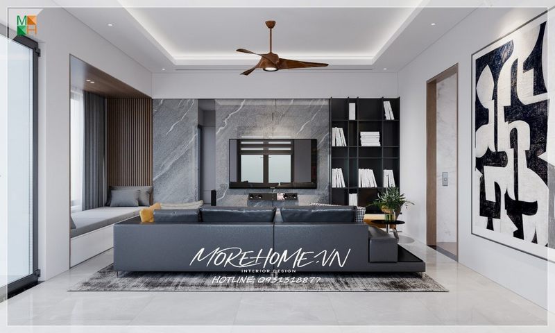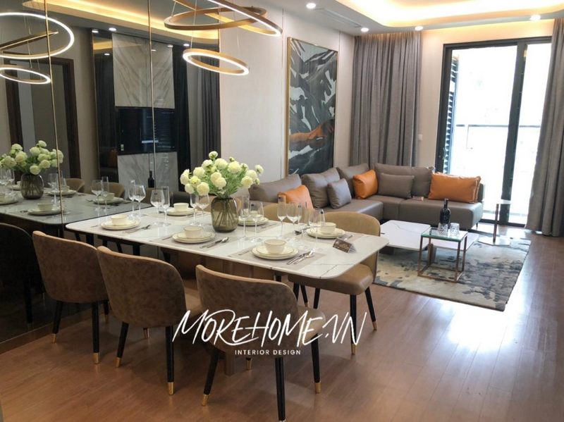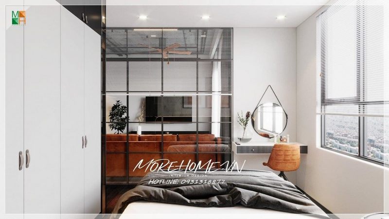 Từ góc bên phải của căn nhà 1 không gian rộng, sáng bao phủ hầu hết không gian của phòng khách căn hộ cửa kính trong suốt đã tạo cho căn hộ thoáng đãng, mát mẻ được thi công hoàn thiện từ bản vẽ của các kiến trúc sư Morehome.