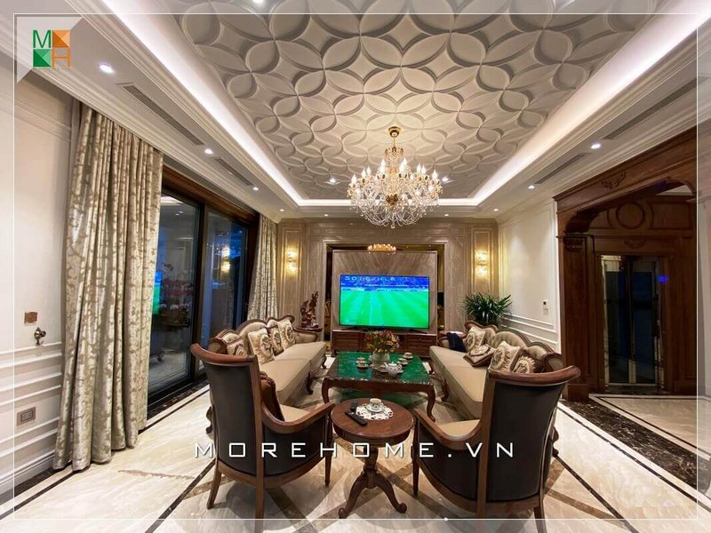 Mẫu thiết kế phòng khách phong cách cổ điển cho chung cư, nhà phố, biệt thự, với đồ nội thất gỗ tự nhiên cao cấp