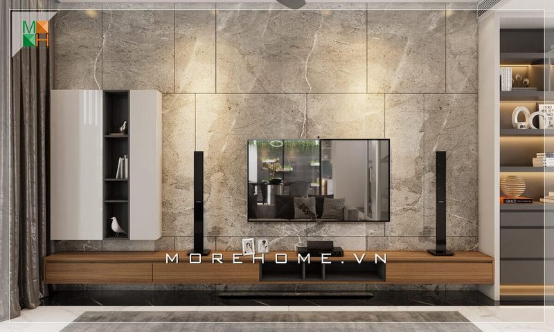 Đá ốp vách tivi màu trắng vân mây hiện đại tạo điểm nhấn sự sang trọng, cao cấp