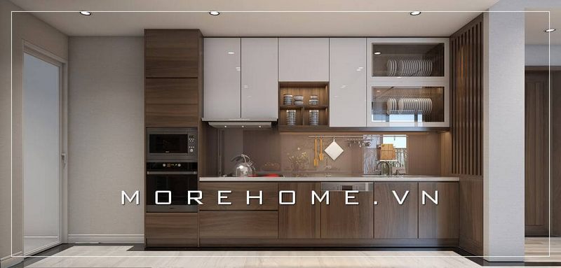 Mẫu tủ bếp gỗ công nghiệp sử dụng gam màu nâu - trắng hiện đại, thiết bị bếp đa năng giúp không gian phòng bếp tinh tế và tiện nghi hơn